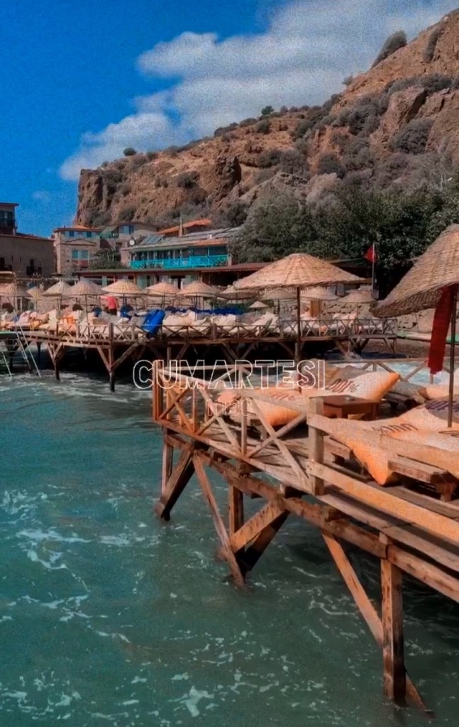 Ertesi sabah kahvaltımızı ettikten sonra bu şezlonglara yerleşiyoruz. “Beni unutmayın.” diyen minnoş, daha ayılıp işe gelememiş. Gerçekten bulunduğumuz noktadan, dağların altına kurulmuş antik liman şahane görünüyor. Fakat şansımıza öyle bir rüzgar var ve deniz o kadar dalgalı ki! Biz orada yatarken, ustalar gelip üzerinde yattığımız iskeleyi sökmeye başlıyor. “Siz hiç rahatsız olmayın, keyfinize bakın.” diyorlar, ama merdiveni söküyorlar. Kahkahalarla gülerek biraz güneşlendikten sonra kalkıyoruz oradan, arabaya atlayıp Altınoluk’a doğru yol alıyoruz.
