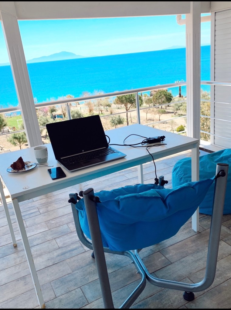 Evden tamamen bağımsız, kendi banyosu ve kahve makinesi olan teras katını ben ofisim ilan ediyorum. Gün boyu Samos’u ve masmavi denizi izleyerek sözleşmeler yazıyorum, zoom ve teams toplantı trafiği başlayınca arkadaki odayaya geçiyorum. Annemle babam uzun kahvaltılar yaparken ben bilgisayar başında bir şeyler atıştırıyorum; onlar uyurken ben arkadaşlarımla buluşmaya gidiyorum.