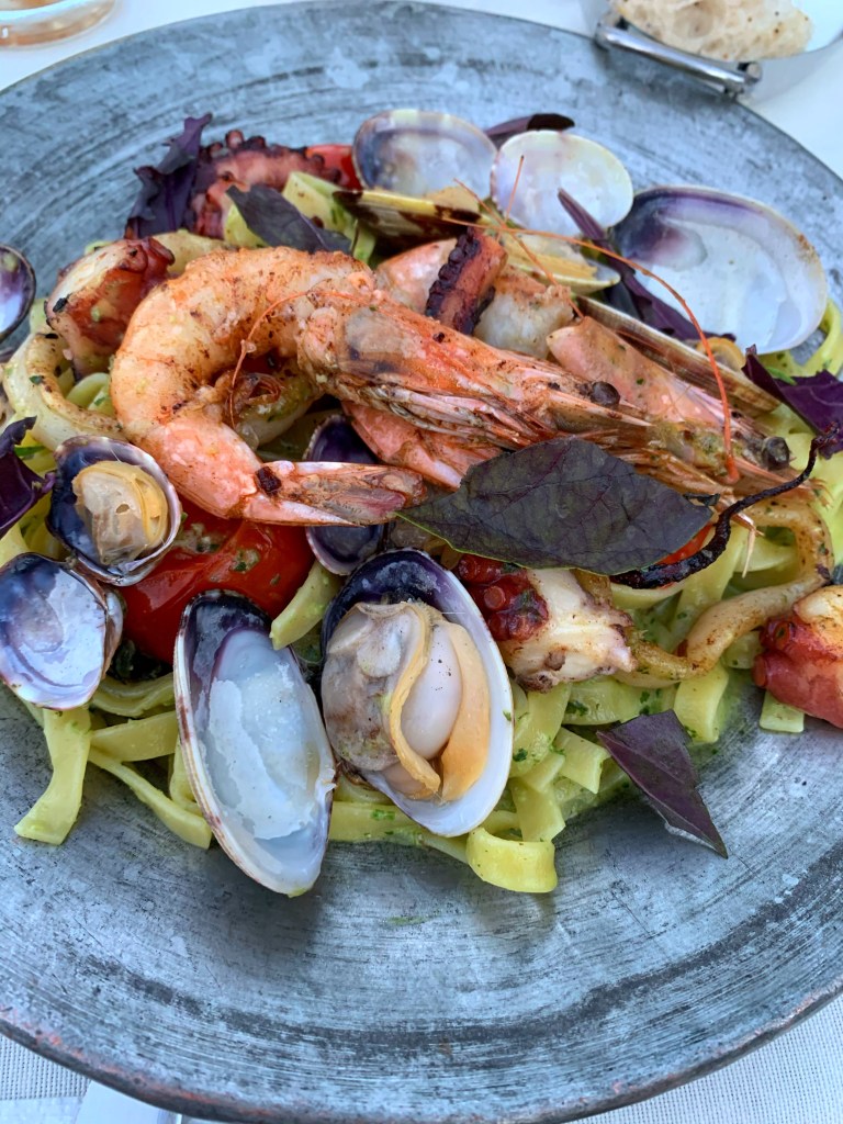 Ana yemek olarak da aşağıda görselde bulunan karma yeşil pesto ile frutti di mare, taglitelle, confit domates, karides, kalamar, kum midyesi ve ahtapot yedik. (160TL) – Buna masadaki herkes vuruldu. Ben hiç deniz ürünü olmasa bile yine de çok severdim, karma yeşil pestoları o kadar lezzetli bir sos olmuş ki!