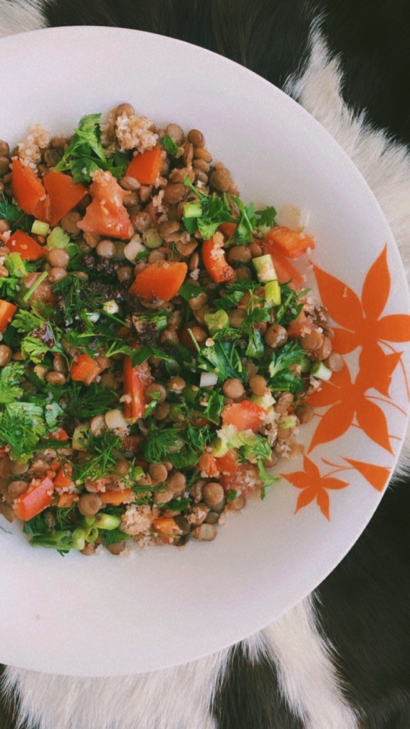 İkinci tarif ise Jamie Oliver’dan. İnce bulguru suda bekleterek şişiriyor, yeşil mercimekleri haşlıyorsunuz. Mercimekleri haşlarken, içine koku vermesi için defne yaprağı atıyorsunuz. Sonra bol yeşillik (ben taze soğan, maydonoz ve dereotu koydum) ve domates ile tahıllarınızı karıştırıyorsunuz. Zeytinyağı ve limon sosunuza bolca sumak eklemeyi unutmayın, bu tarifi zirveye çıkartan detay bu.