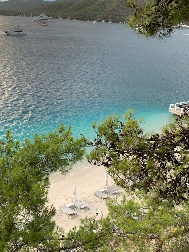 Gelin hamamımızı yaptıktan sonra, D-Marin’in spa’sından çıkıyoruz, otelin golf arabalarından birine atlayıp Q Lounge‘a tırmanıyoruz. Ormanın içinden geçerek, yanımızda nefis bir deniz manzarası ile tepeye doğru çıkan yol inanılmaz keyifli. Islak saçlarla o rüzgarı yemek ise önümüzde uzun bir parti maratonu olduğunu düşünürsek hiç mantıklı değil.