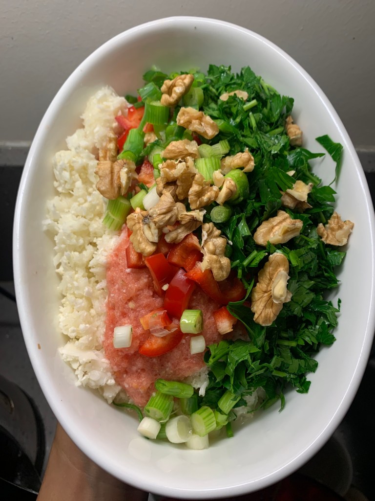 Karnabahar’ın tam mevsimi. Rondodan küçücük olana kadar geçirdikten sonra, yeşillikler, domates, soğan ne bulursanız karıştırdığınızda hem çok doyurucu hem de leziz bir salata oluyor. Ketojenik beslenirken, daha önce bulgur kullandığım bütün salataları rondolanmış karnabahar ile yapmaya başlamıştım. Hala da çok severim. Kısır, tabule türevlerinin hepsi şahane oluyor.