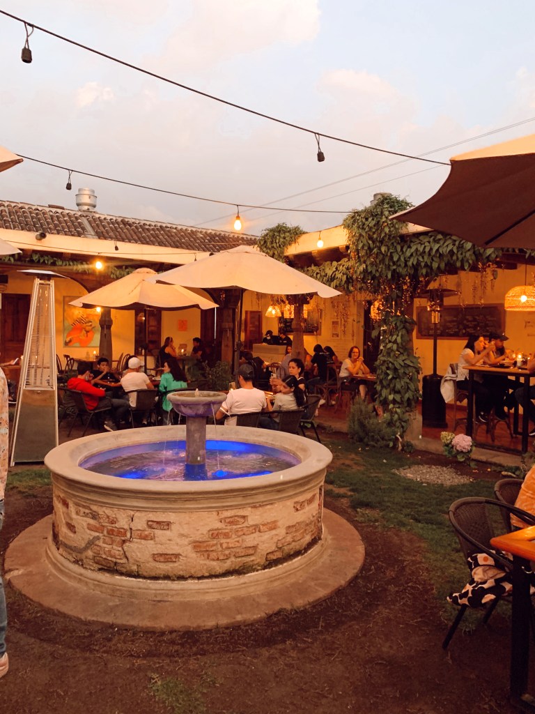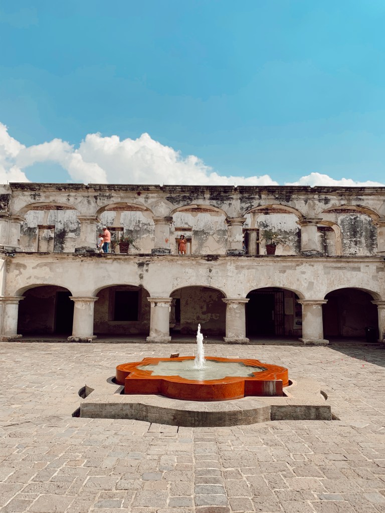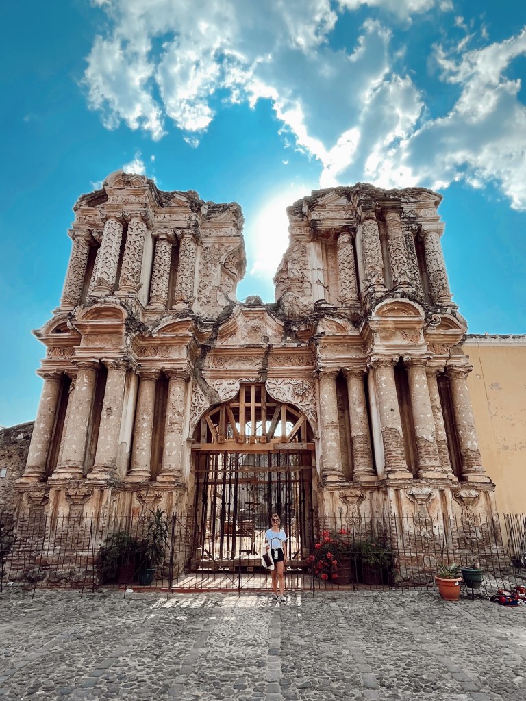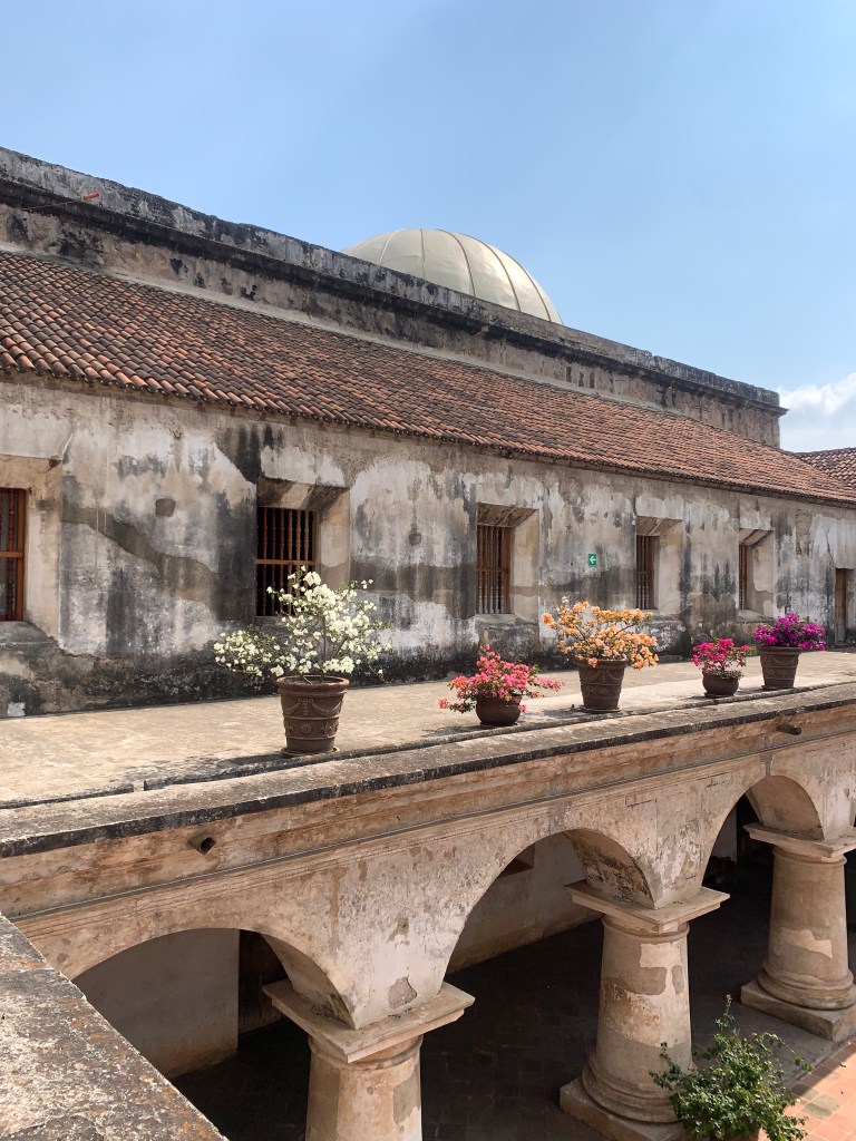Biz Antigua’da, şehirdeki en ikonik şeylerden biri olan Santa Catalina’nın sarı sütunun tam ayağında kalıyoruz. Avlumuzda oturduğumuzda, kilisenin çan sesleri dibimizde çalıyor. Herkesin önünde fotoğraf çektirdiği nokta, tam bizim kapımızın önü.