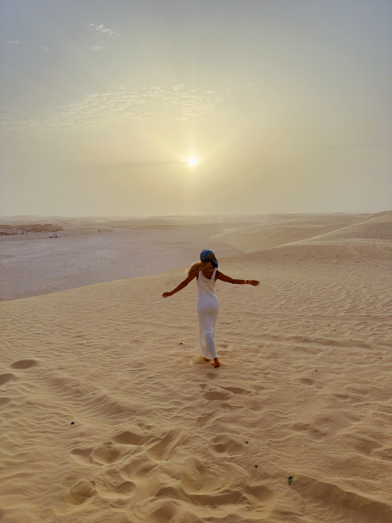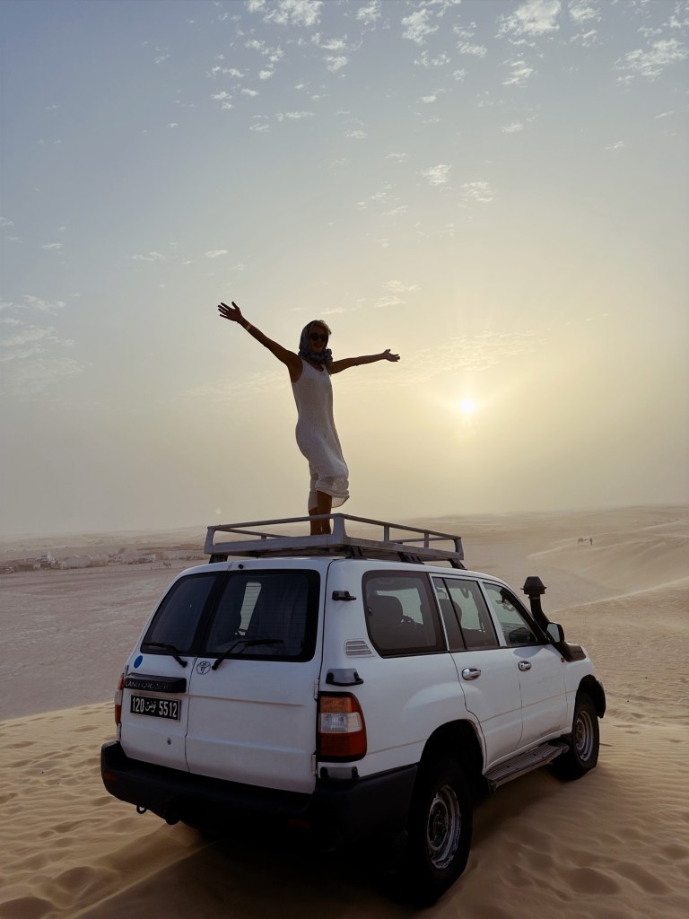 Star Wars setinde gezdikten sonra yeniden arabaya biniyoruz, Tunus müzikleri eşliğinde dans ederken, çıtır yakışıklı şoförümüz ani bir hareketle yanımızdaki minik kum tepeciğinin üzerine doğru direksiyonu kırarak jeep’imizi biraz yana yatırıyor. Beklemediğimiz anda gelen bu aksiyona bayılıyoruz, çığlıklar atarak “Bir daha bir daha.” diye alkışlamaya başlıyoruz. Ki zaten bu nabız yoklama kısmıymış, biz sevecek miyiz, korkacak mıyız bu ölçülüyormuş. Ondan sonra saatlerce jeep safari yapıyoruz. Biz hep daha fazlasını istedikçe, çıtır şoförümüzün de yüzü gülmeye başlıyor. Aracın tam olarak dikey pozisyonda olacağı kadar dik tepelere çıkıp, aynen öyle tepelerden aşağı iniyoruz. Her hamleden sonra bize gururla lastiklerimizin izini göstermek için duruyor, biz alkışlıyoruz ve daha aksiyonlu bir sonraki hamlemize geçiyoruz. Muazzam bir adrenalin, muazzam bir görüntü, muazzam bir keyif.