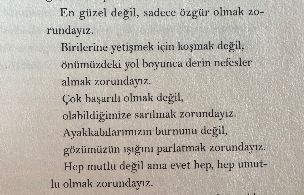 Hem koştuğum, hem aradığım o günde bu cümleler çok sert geliyor. Varmaktan da bulmaktan da çok uzağım o an. Kitabın kapağını tekrar kapatıyorum, o sırada yanımda oturan kız “Afedersiniz, siz Türk müsünüz?” diye soruyor.