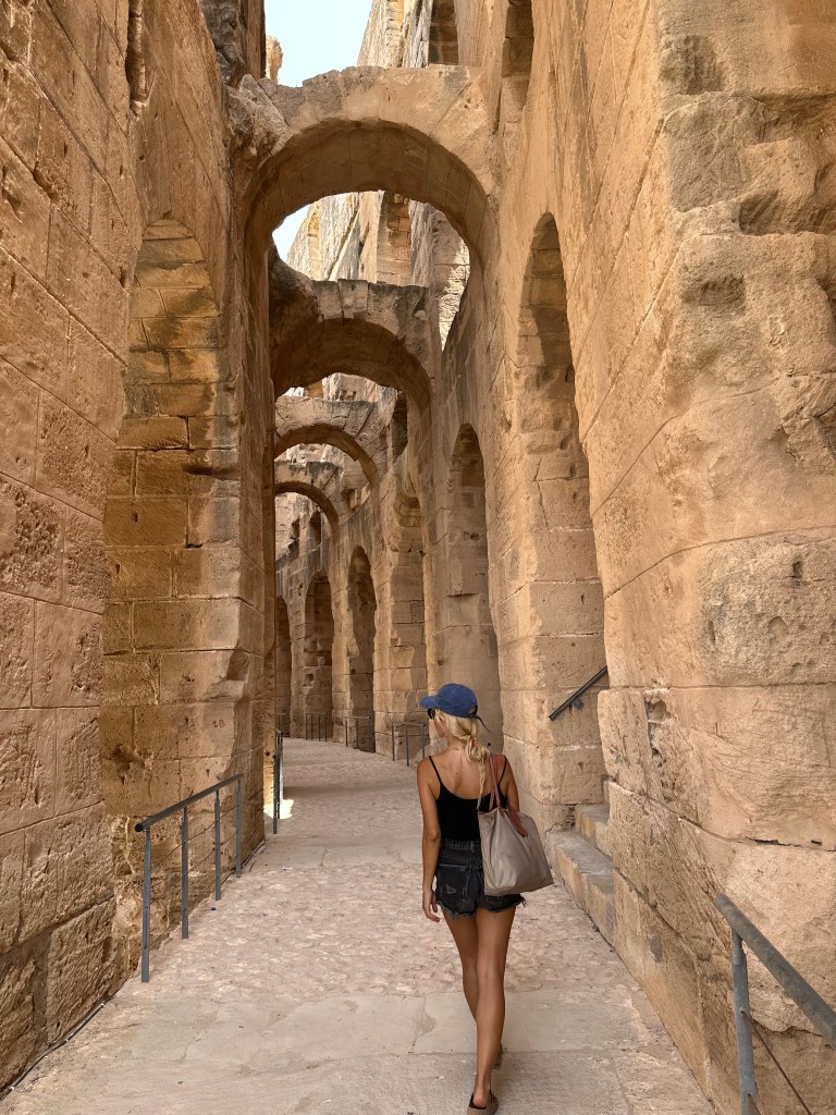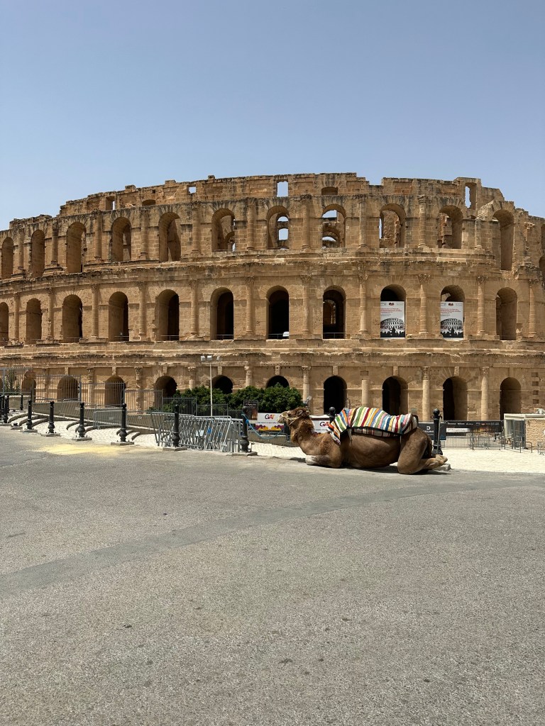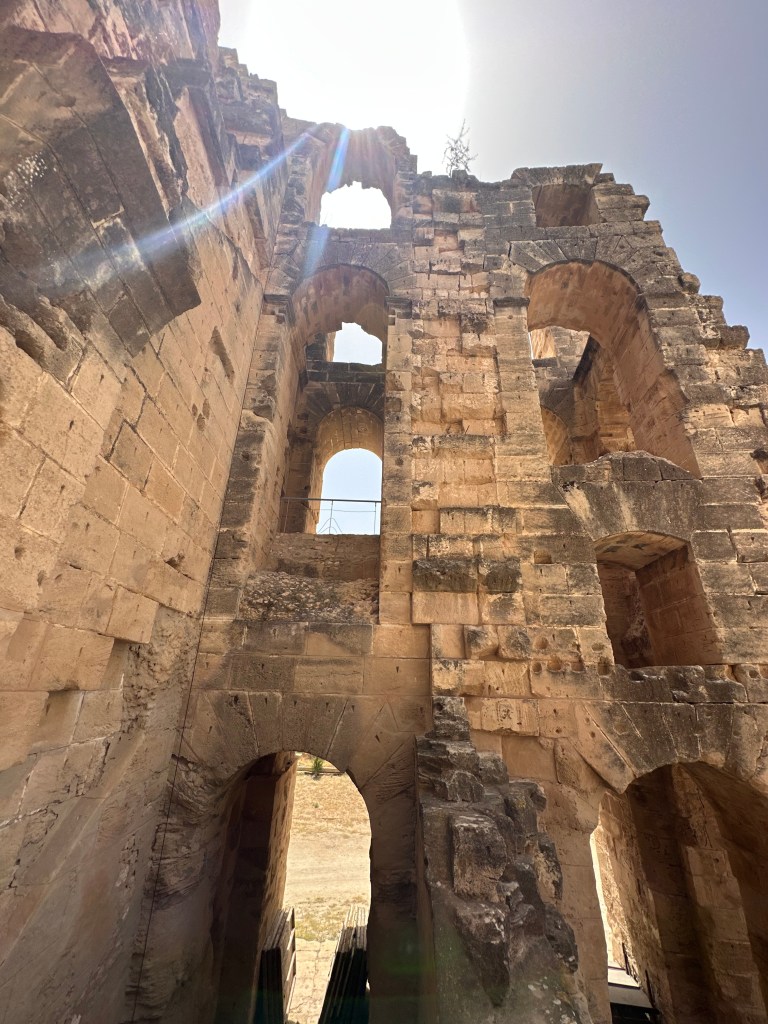 El Jem, dünyadaki en büyük amfitiyatrolardan biri. Buranın Roma İmparatorluğu’na ait olduğu MS 230 civarında inşaa edilmiş ve dünyadaki en iyi korunmuş Roma İmparatorluğu kalıntılarından biri. Gitmeden önce araştırma yaptığımız hiç bir rehber El Jem’i mutlaka gezilmesi gerekenler arasında saymadığından ve biz Tunus’a dönüş yolumuz üzerinde olduğundan buraya geldiğimizden, heybeti ve iyi durumu karşısında oldukça şaşırıyoruz.