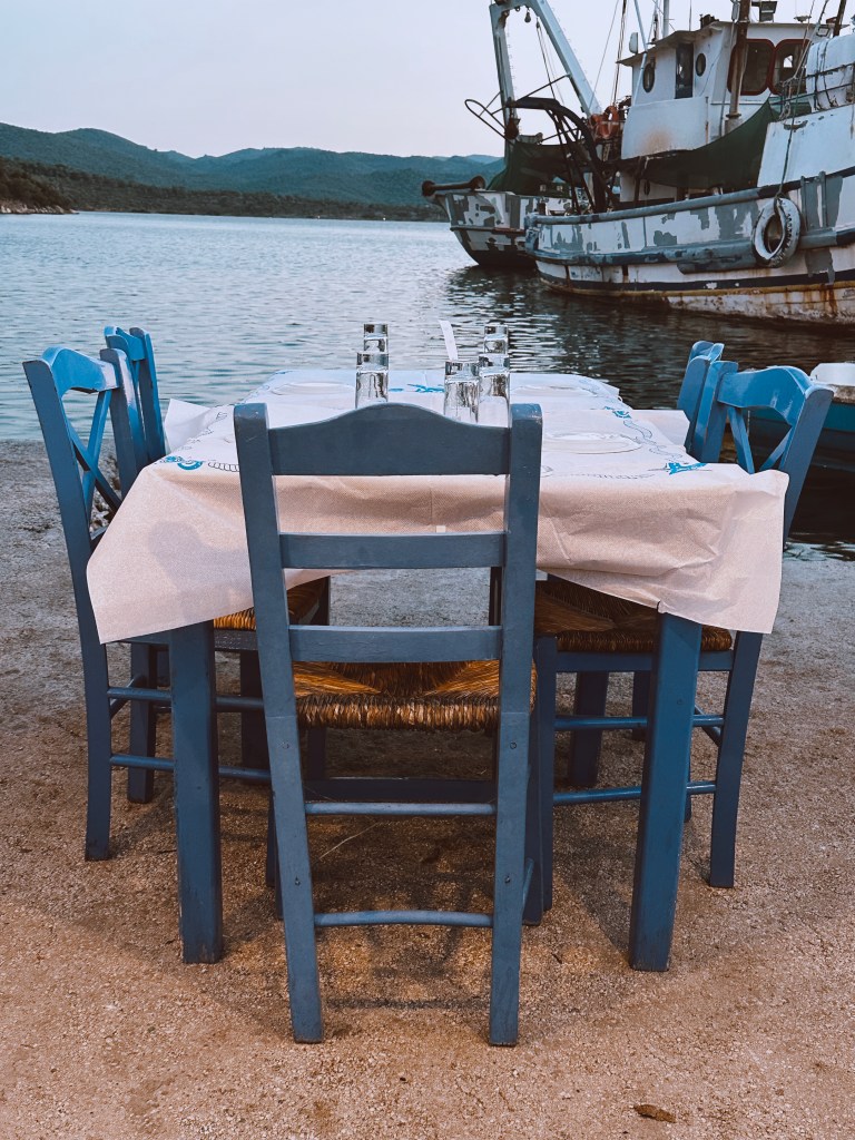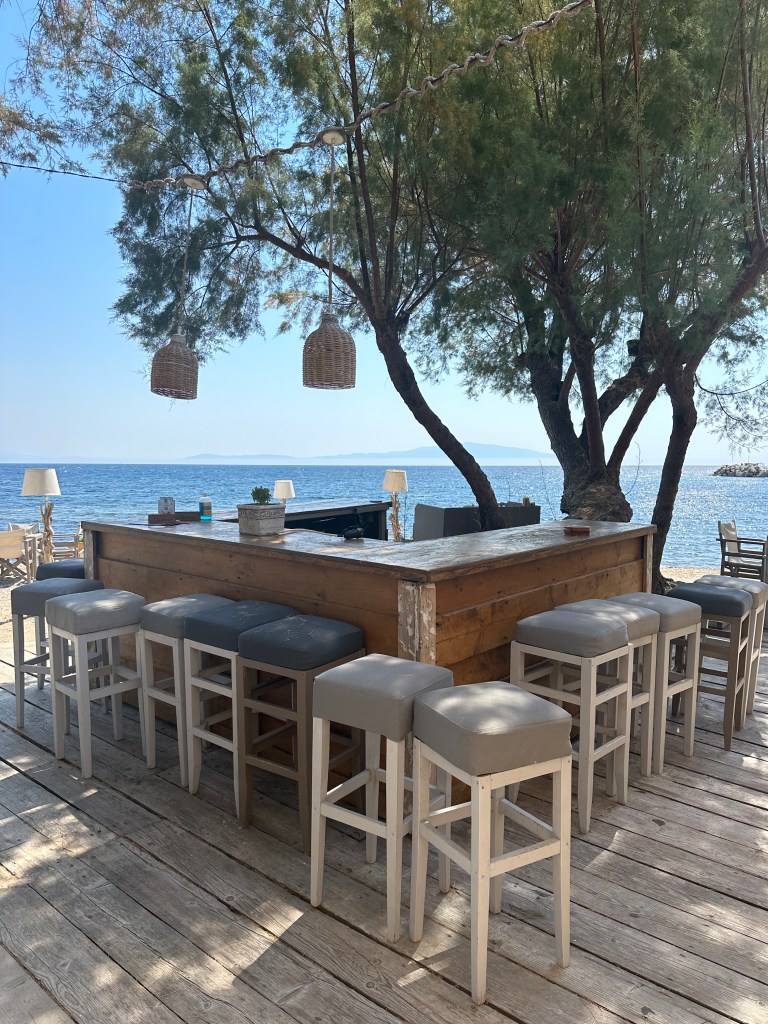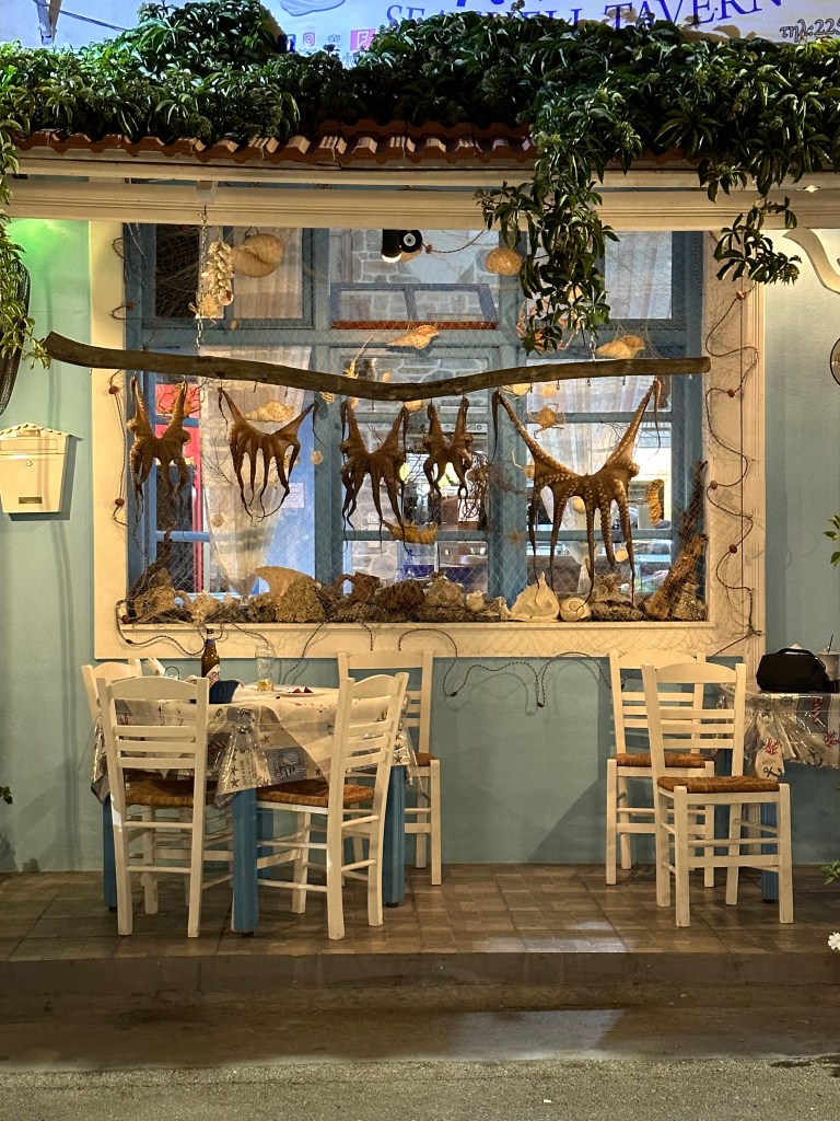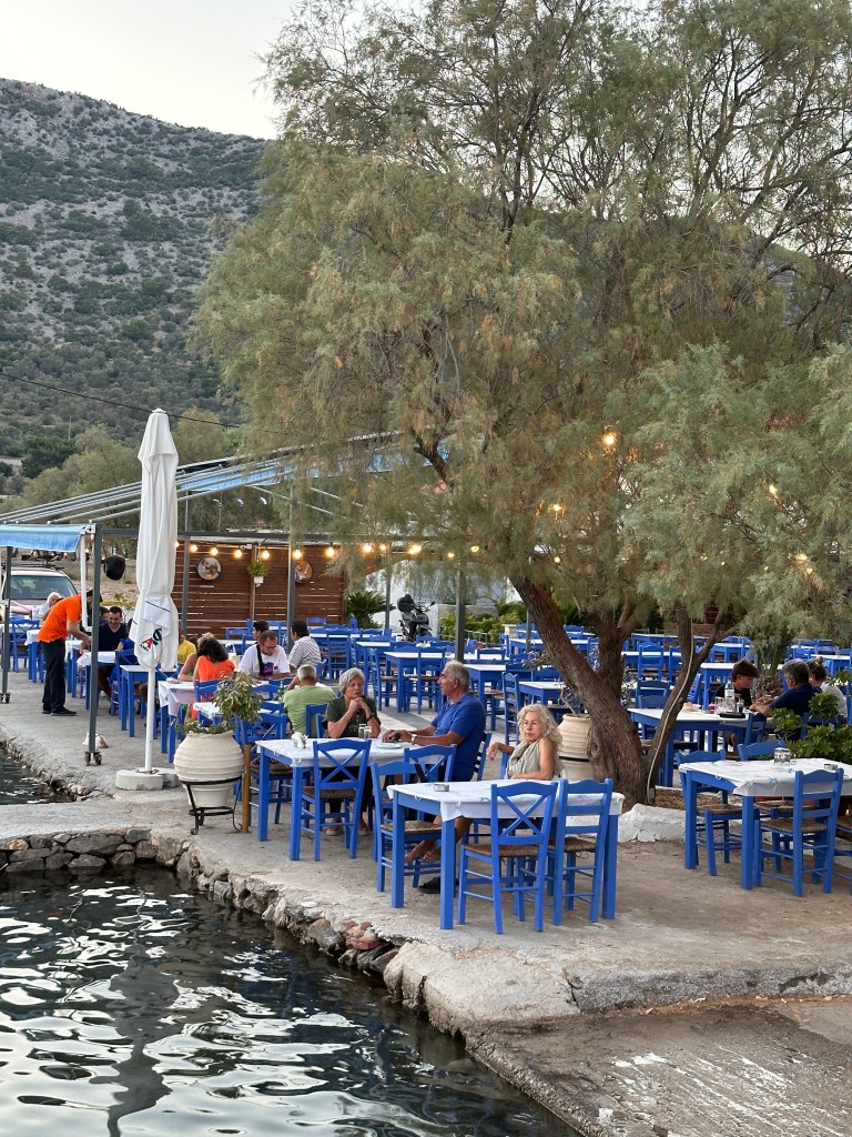 Hemen kasaba meydanın ortasındaki iki cafe, gündüzleri kıraathane gibi görünse de, geceleri sokağa attıkları masalarla bir anda meyhaneye dönüşüyor. Yaşlı çiftleri oraya gelmiş, keyifle ouzolarını içip akşam yemeklerini yerken izlemek müthiş keyifli. Ayrıca yine gündüz burada oturup frappe içmenizi de tavsiye ederim.