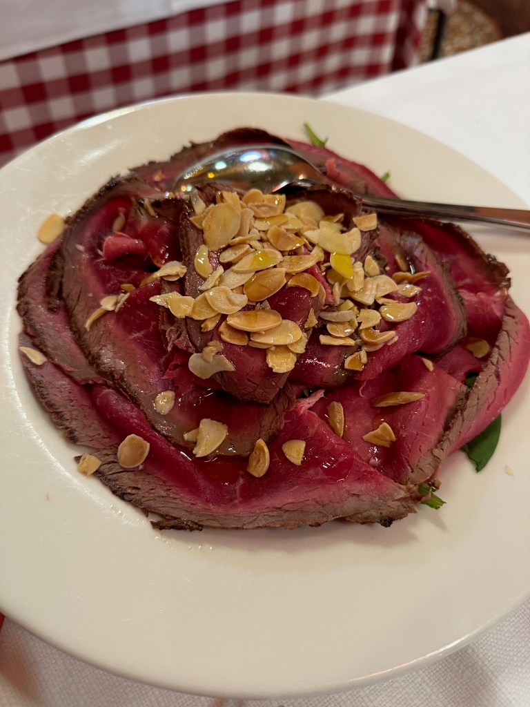 Biassanot kelimesinin anlamını da çok sevdim, Bolonya bölgesine özel diyalekt bir kelimeymiş; gece erken yatmayı sevmeyen, geceleri dolanan kediler gibi arkadaşların, iyi yemeğin ve içkinin peşinde koşanları ifade ediyormuş. Burası frapan bir dekorasyonu olmasa da lokallerin çok sevdiği, gelen turistlere biraz burun kıvırılan bir restoran. Burada fıstıklı makarnayı çok sevdik, carpaccio’ya da kavrulmuş bademin ne kadar yakıştığını keşfettik.