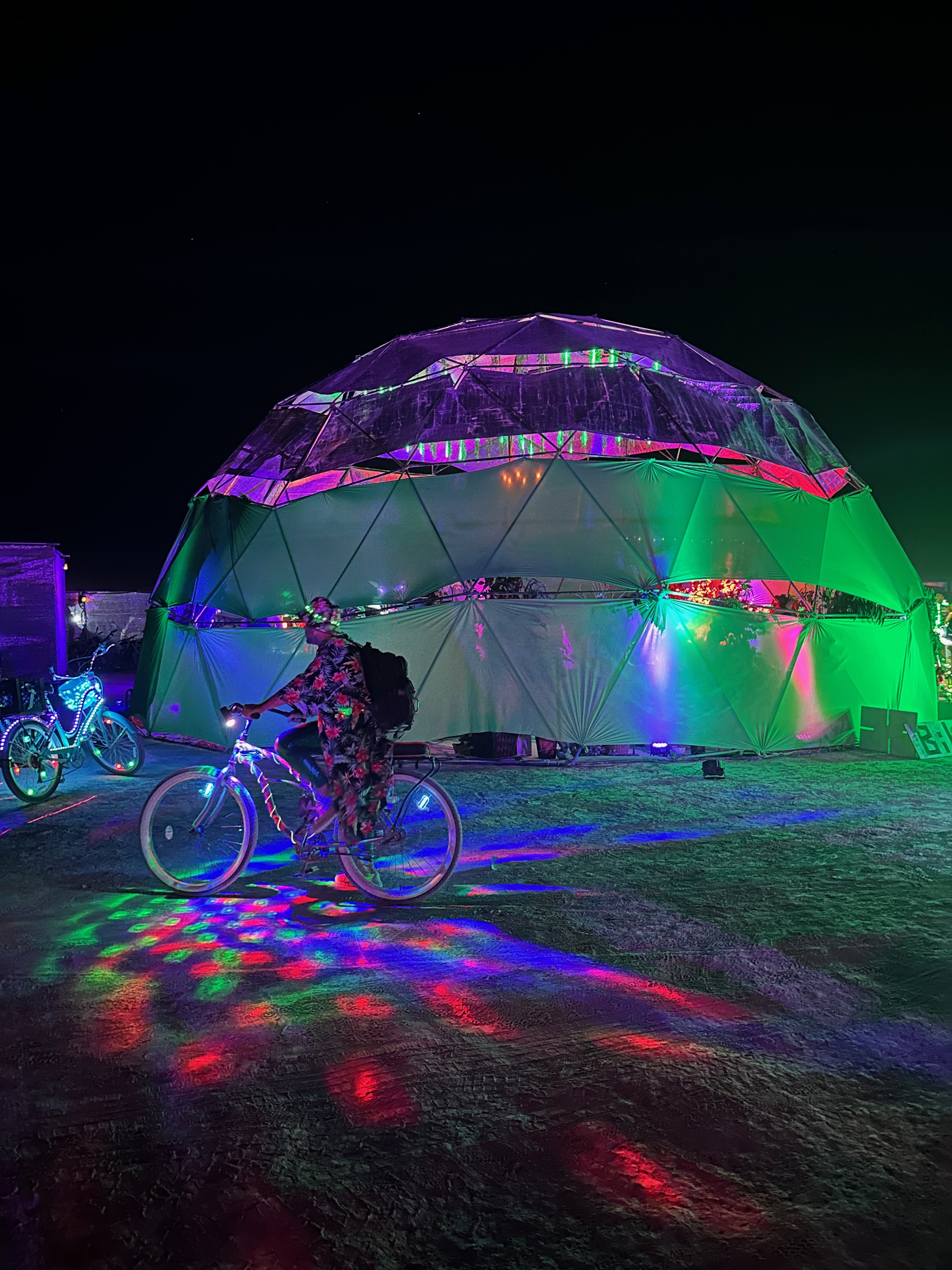 Hepimiz bisikletlerimizin üzerine atlıyoruz, bangır bangır müzik çalan art-car’ın peşinden çölün derinliklerine gitmeye başlıyoruz. Art-car durunca durup bisikletlerimizi bırakıp dans etmeye başlıyoruz, hareket etmeye başladığında yine bisikletlerimizle onu takip ediyoruz.