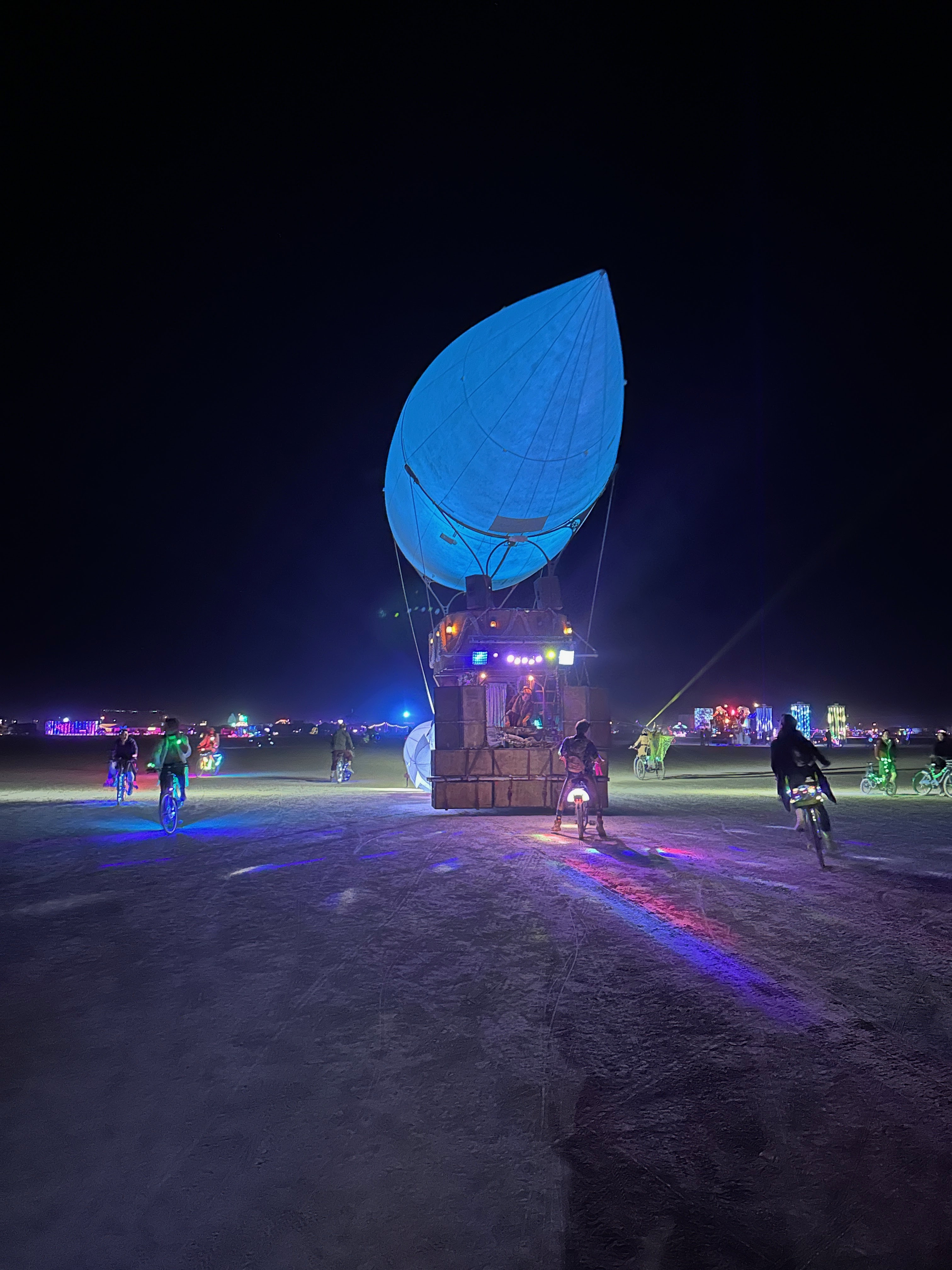 O gece bizim kamp ekibindeki DJ’lerden Riley, airpusher collective isimli bir art-car’da çalıyor, hep birlikte onu dinlemeye gidiyoruz. Biz olağan bir DJ setinin önünde dans eder gibi orada dans ederken, art-car hareket etmeye başlıyor.