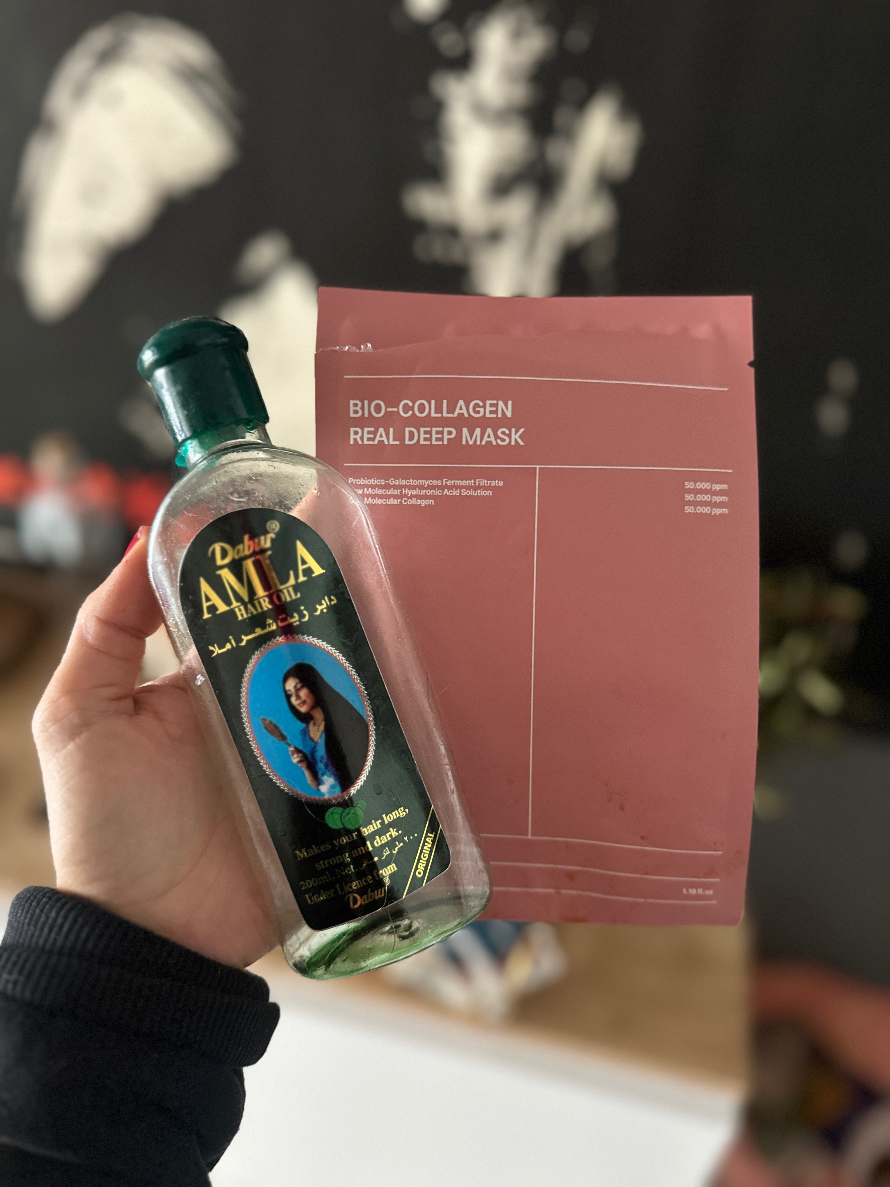 Son dönemde çok popüler olan kozmetiklerden denemeler yapıyorum. Instagramı sallayan kolajen maskesinin bir balon olduğunu düşünüyorum, ama Amla saç bakım yağı saçlarıma gerçekten çok iyi geliyor.