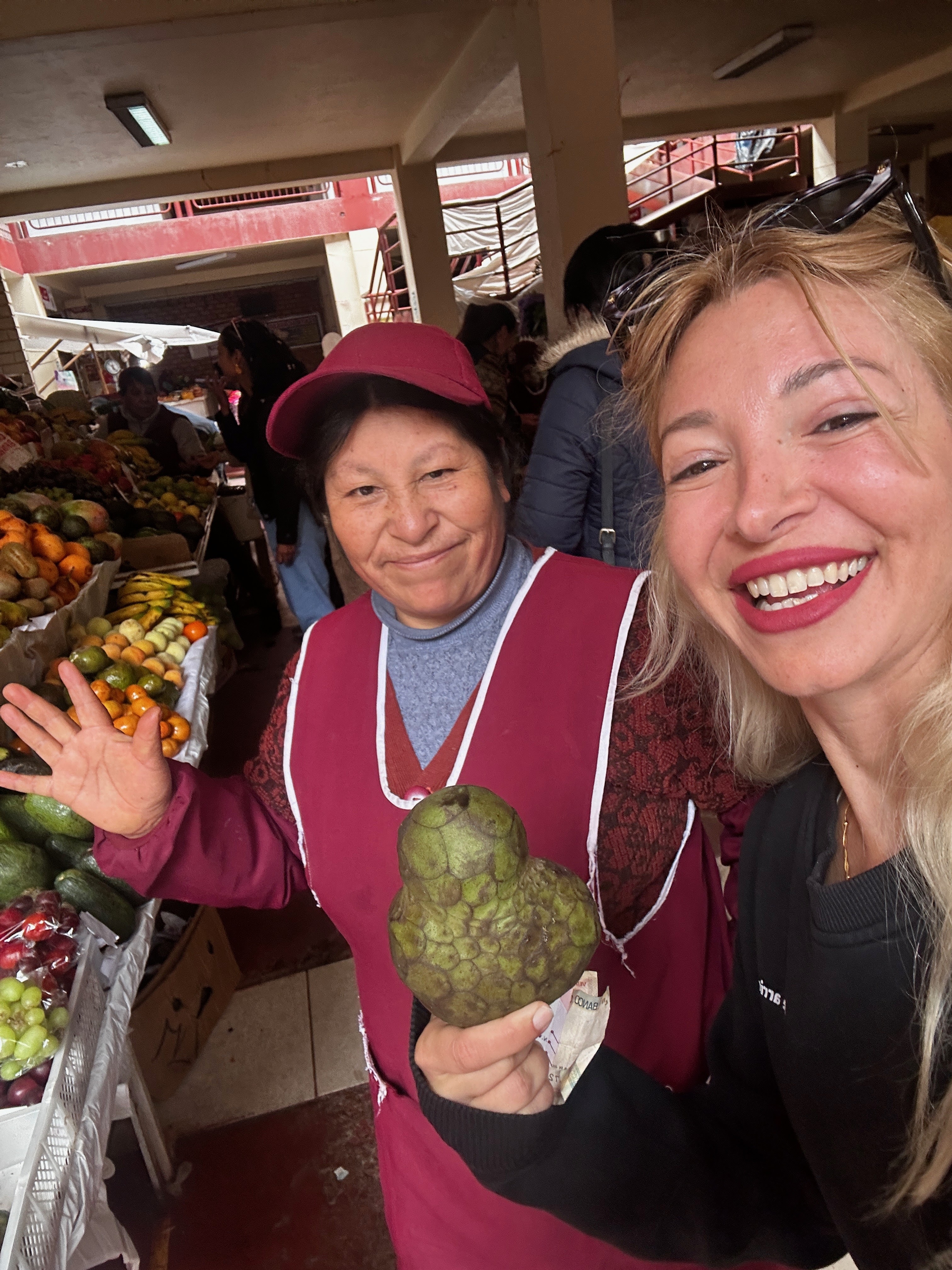Mesela yukarıdaki ilk fotoğrafta coca yaprakları satılıyor, ikincisinde yerde duranlar patates, üçüncüsünde elimdeki meyve “cherimoya”. Gerçekten aromalı sakız gibi kokuyor ve oldukça tatlı, İnka İmparatorluğu döneminde “tanrıların meyvesi” olarak anılıyormuş.