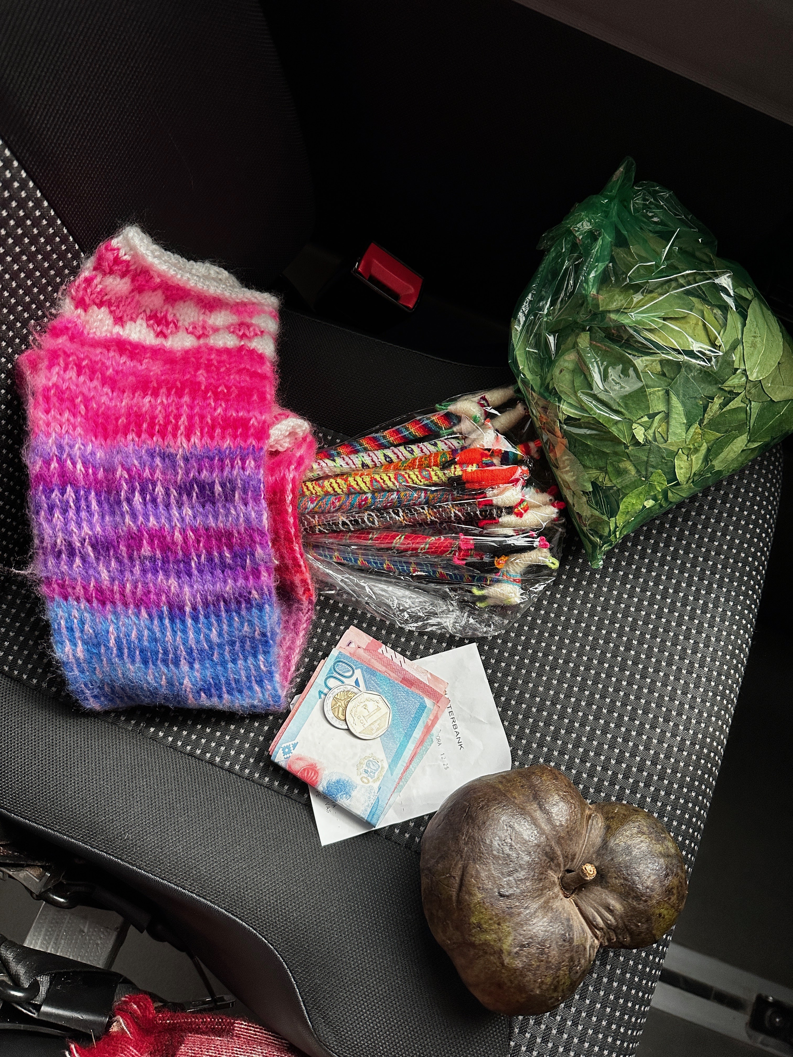 Bir gün “acil ihtiyaçlar” için çarşıya indikten sonra geri dönerken çok gülüyorum acil ihtiyaç diye aldıklarıma: Coca yaprağı, temple’daki seramonilerde ayaklarım üşüyor diye yün çorap, journaling için kalemler ve cherimoya.