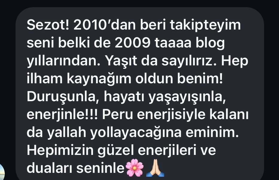 Peru’daki şifa çalışmalarının hayatımdaki etkisinden ayrıca uzun uzun bahsedeceğim, onlar upuzun ayrı yazılar olur. Şimdilik kısaca şunu söyleyebilirim ki; o çalışmalarda hep “Hastalığa ve sebebine değil, sağlığa, mutluluğa, nerede kalbinin daha mutlu olduğuna odaklan.” yönlendirmesini aldım.