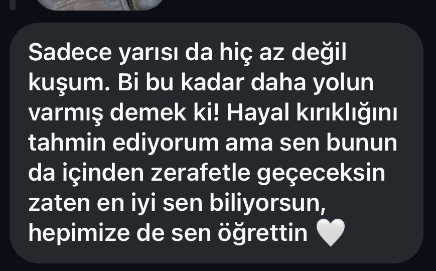 Bildiğim ve yapabileceğim her şeyi yapmıştım ve daha hala yarı yarıya bir küçülmeden bahsediyorduk. Gücüm kalmamıştı. Yorgundum. İsyan etmeye çok yakındım ki – o dönemde sizlerden her gün aldığım motivasyon mesajları – aşağıda birkaç tanesini paylaşıyorum- o günlerde yataktan kalkıp devam edebilmek için bana inanılmaz bir destekçi oldu.