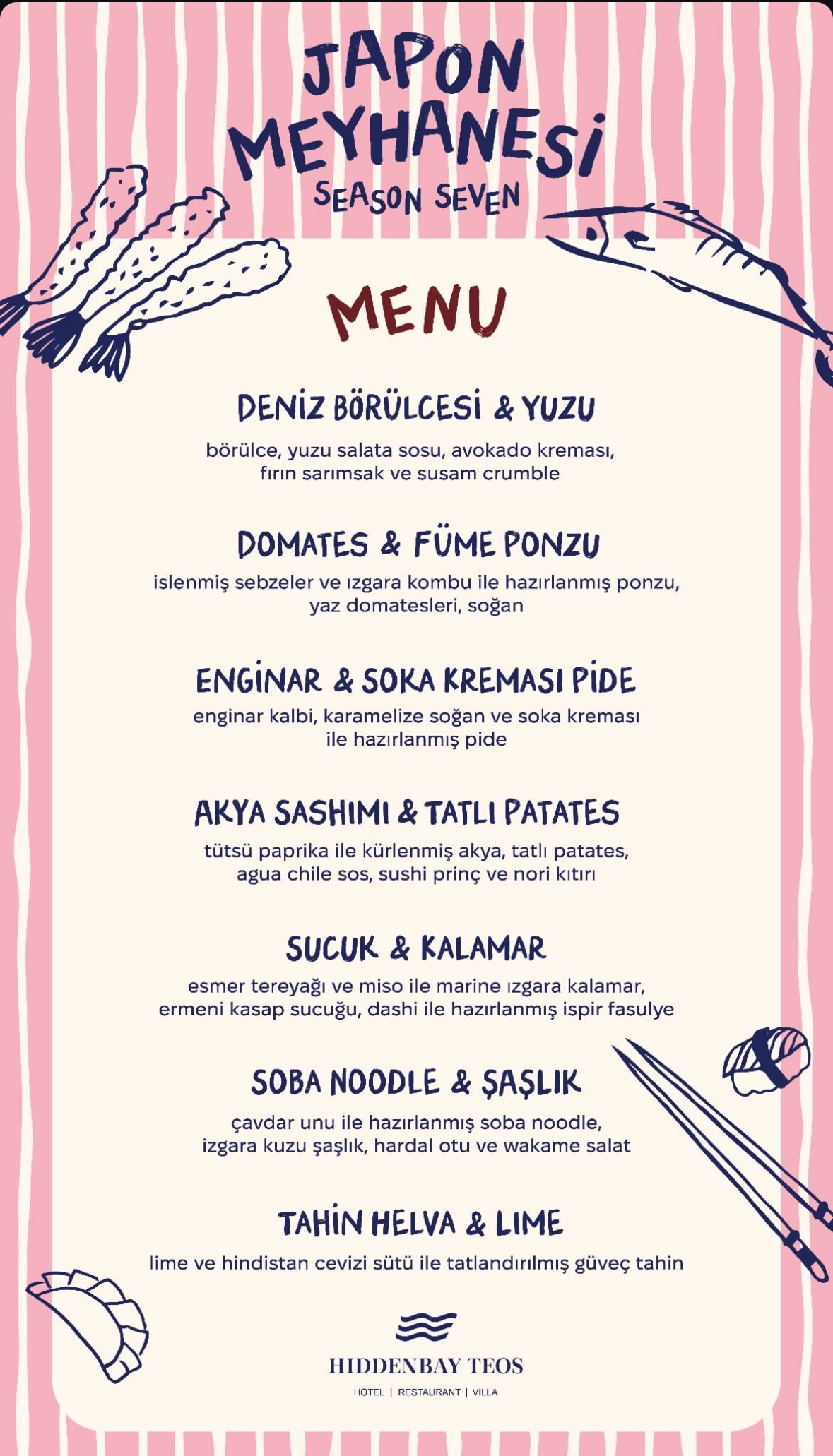Fakat benim bütün tedavi sürecim boyunca, benim minicik evimin mutfağında benim değişen taleplerime göre sürekli müthiş yemekler çıkartarak benim kemoterapi sürecimi çok iyi atlatmamı sağlamış anneme bir jest yapmak ve onu güzel bir yemeğe götürmek istiyorum. Tam o dönemde de şansıma hemen komşu koyumudaki Hidden Bay’de Japon Meyhanesi etkinliği olduğunu fark ediyorum.